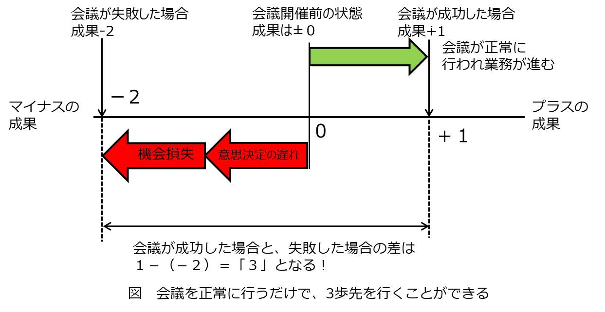 下に図示したように、会議が成功した場合と、失敗した場合の差は思ったより大きいのだ。会議を成功させ業務を1つ進められればそれだけで3歩先を行くことができる。