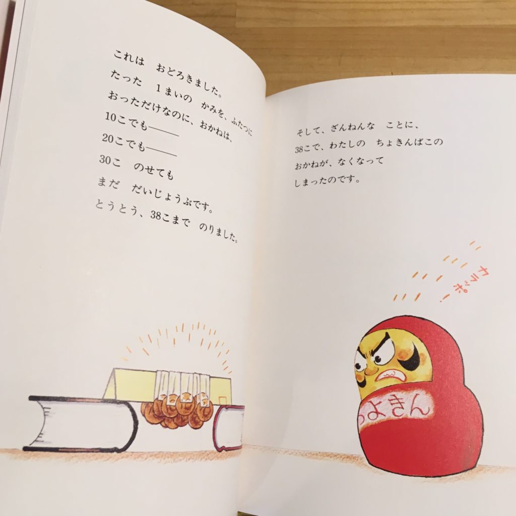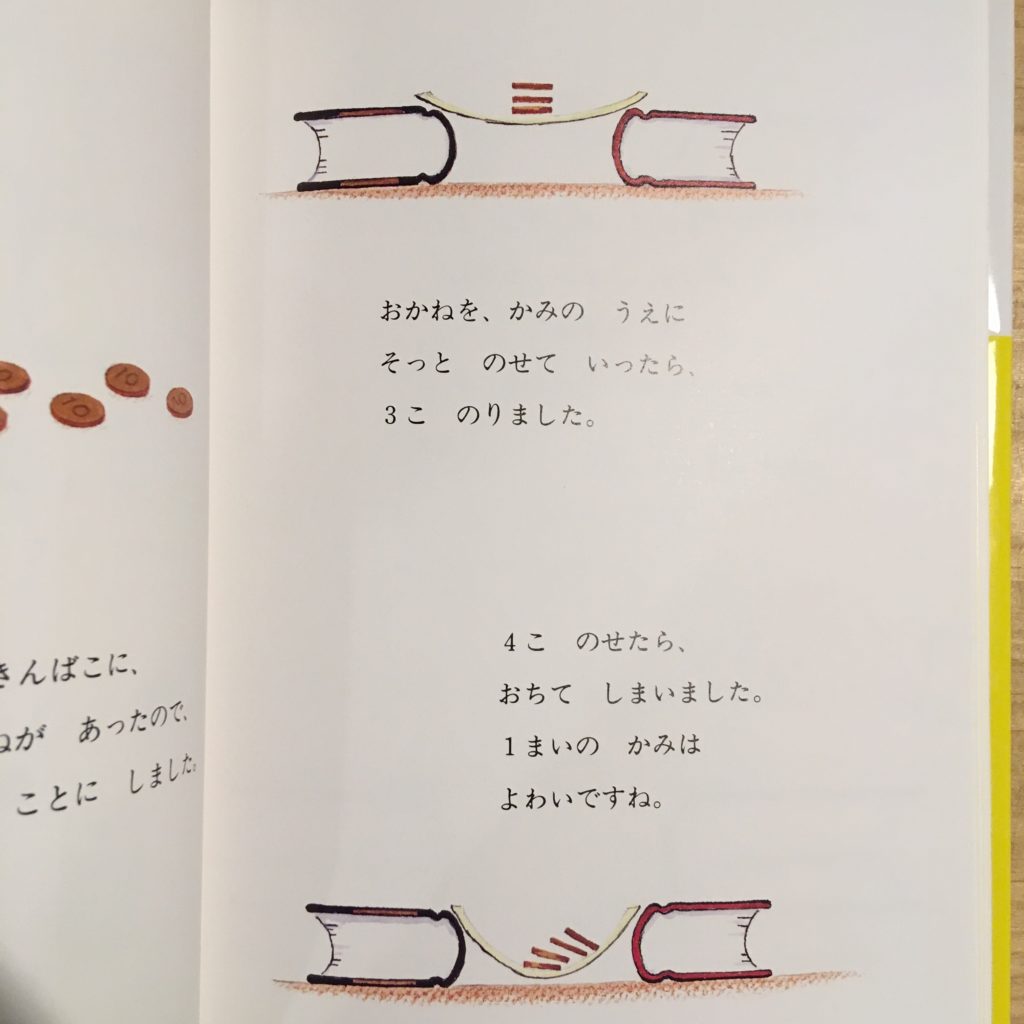 この橋は、38枚の10円玉を載せても壊れない。ではどこまで載せたら壊れるのだろうか。実はそれは本書では示されていない。貯金箱から取り出した手持ちの10円玉がなくなってしまい、評価ができないのだ。橋が結局どこで壊れるのかわからない。ちょっと中途半端な気もする。しかしこれも作者の意図があってのこと。あとがきにはその意図が作者の言葉で語られている。