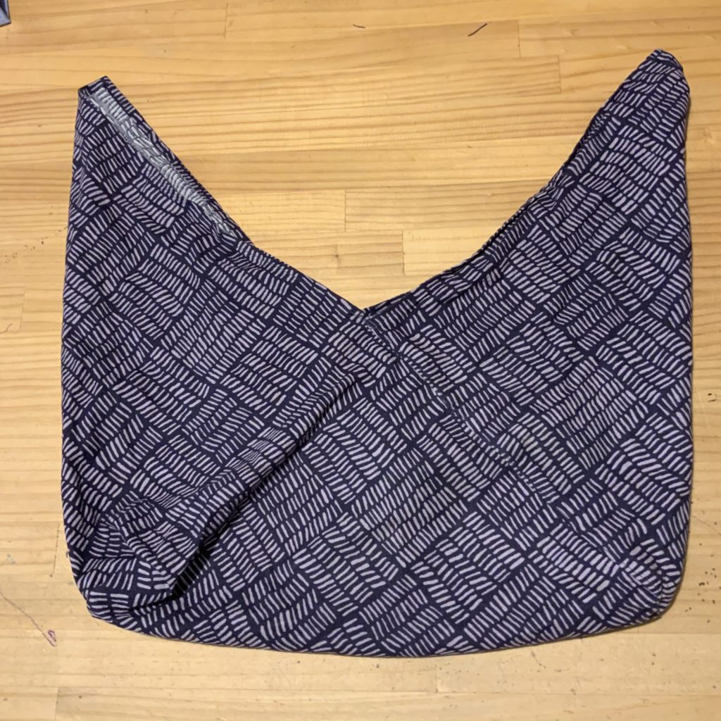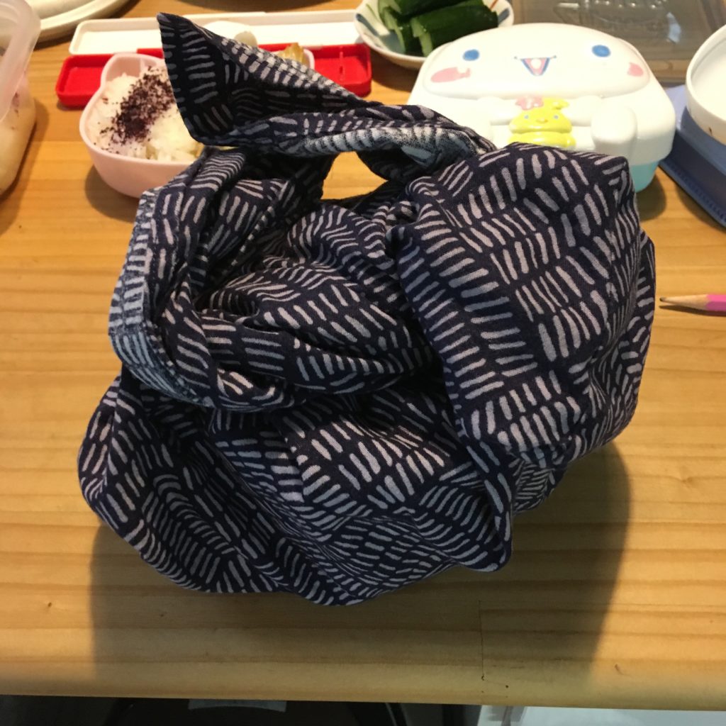 お弁当の仕上げは、嫁の手作り「あずま袋」。あずま袋とは、風呂敷の一部を縫い合わせて袋型にしたような、日本伝統の鞄である。平たくするとこんな感じ。