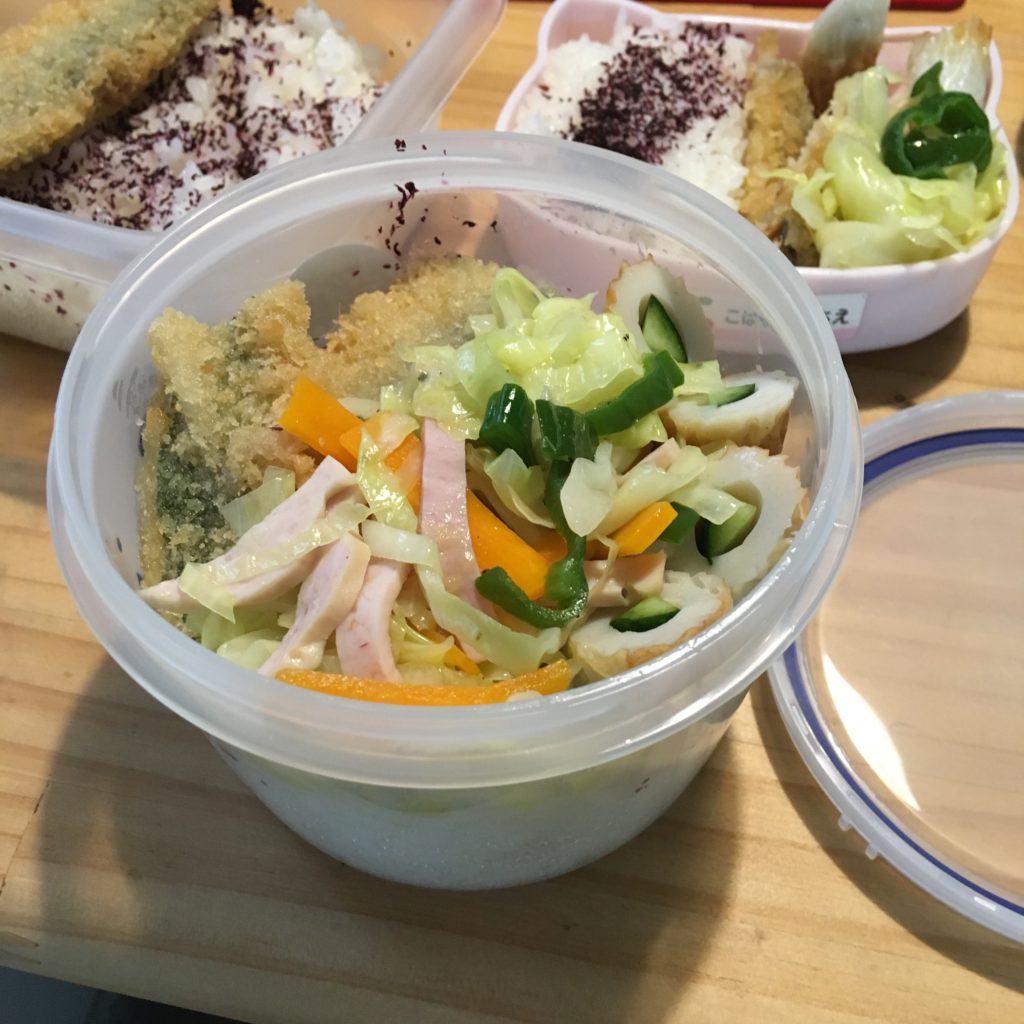 「ゆかり」を振りかけたご飯に、アジの梅肉フライ(冷食)、野菜炒め、ちくわきゅうり。後ろには、娘のキティちゃん弁当と、嫁向けタッパー弁当も覗いている。
