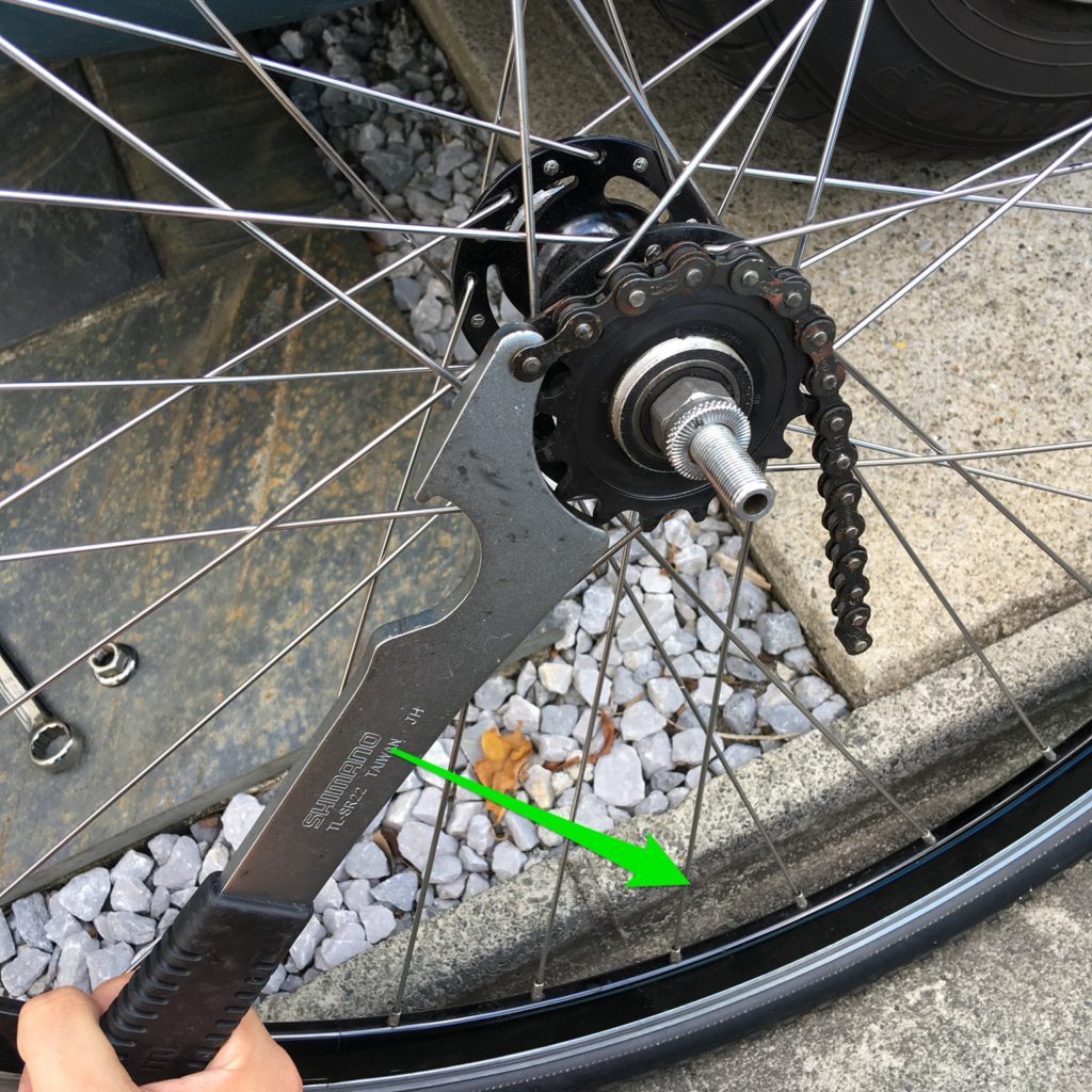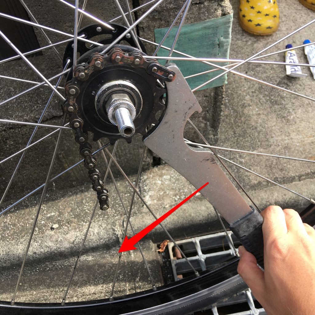 「スプロケット戻し」のチェーンを図のように引っ掛けて、矢印の方向に回します。非常に固く締まっているので、怪我しないように注意して力を込めて作業しましょう。例によって固着している場合には隙間にラスペネを流すのも手です。