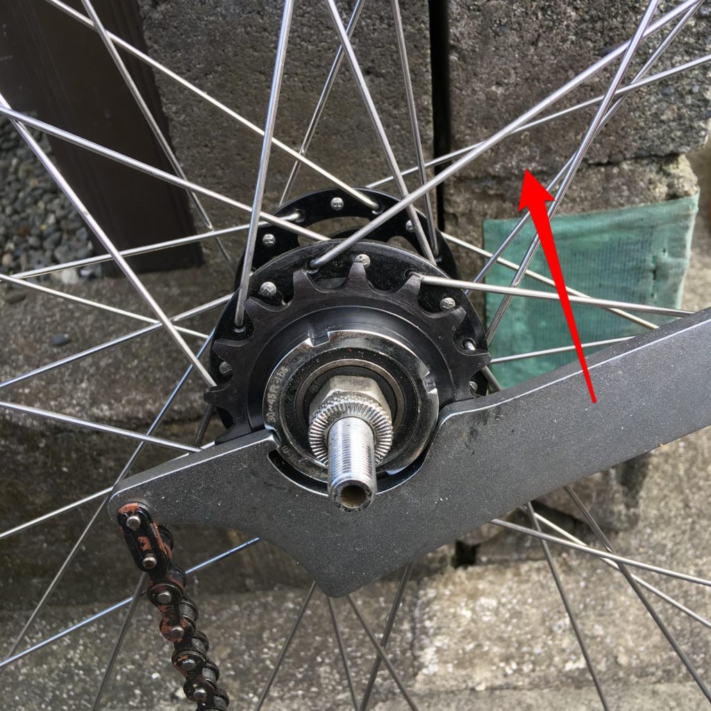まずはリアホイールを外します。方法は、下記の「フリーギアの取付 取り外し」の記事に書いたのでご覧ください。