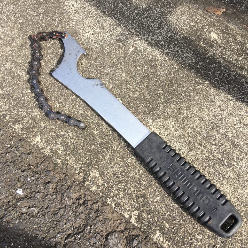 なにはともあれ、これがなくては始まらないのが「スプロケット戻し工具」。多段変速用の物ではなく、シングルスピードに対応した「厚刃」用のものが必要です。シマノの工具なら「TL-SR22」です。