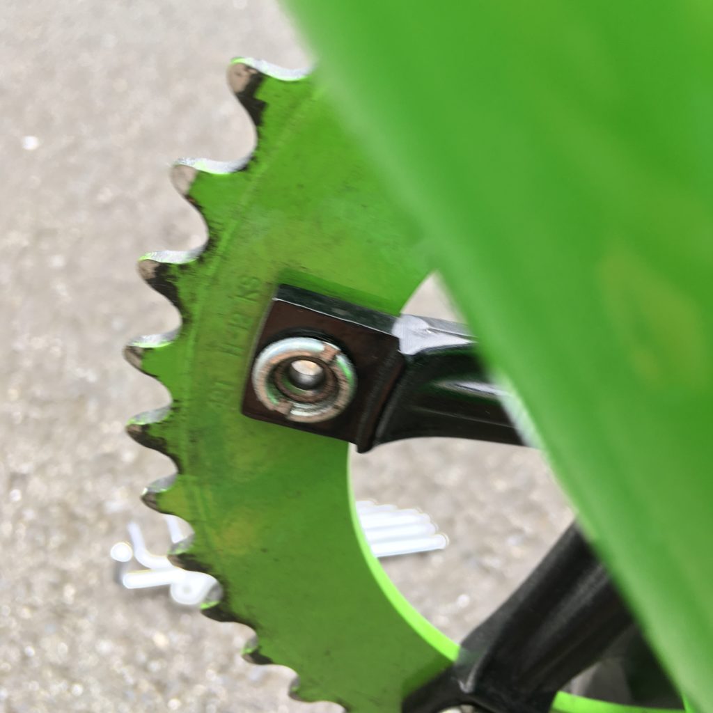 なお、シングルスピードバイクでチェーンリングを交換すると、チェーンの張り具合が変わります。ふつう、調整のためにリアホイールを前後させますが、この時ブレーキシューの位置が、リムのブレーキ面から外れてしまう時があります。
