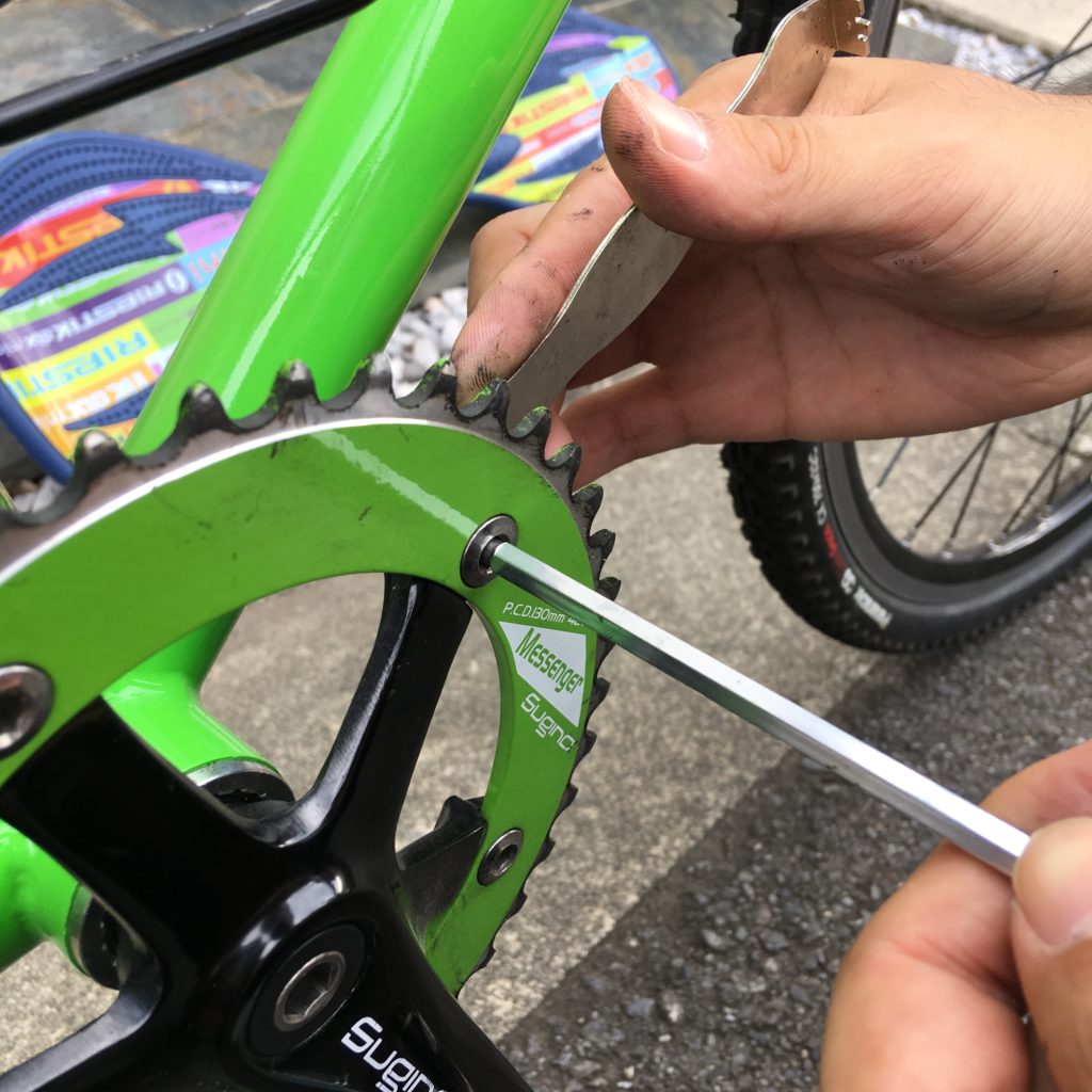 チェーンリングは六角ボルトで止まっています。なので六角レンチは必須です。しかしこれだけではチェーンリングの取付、取り外しはできません。